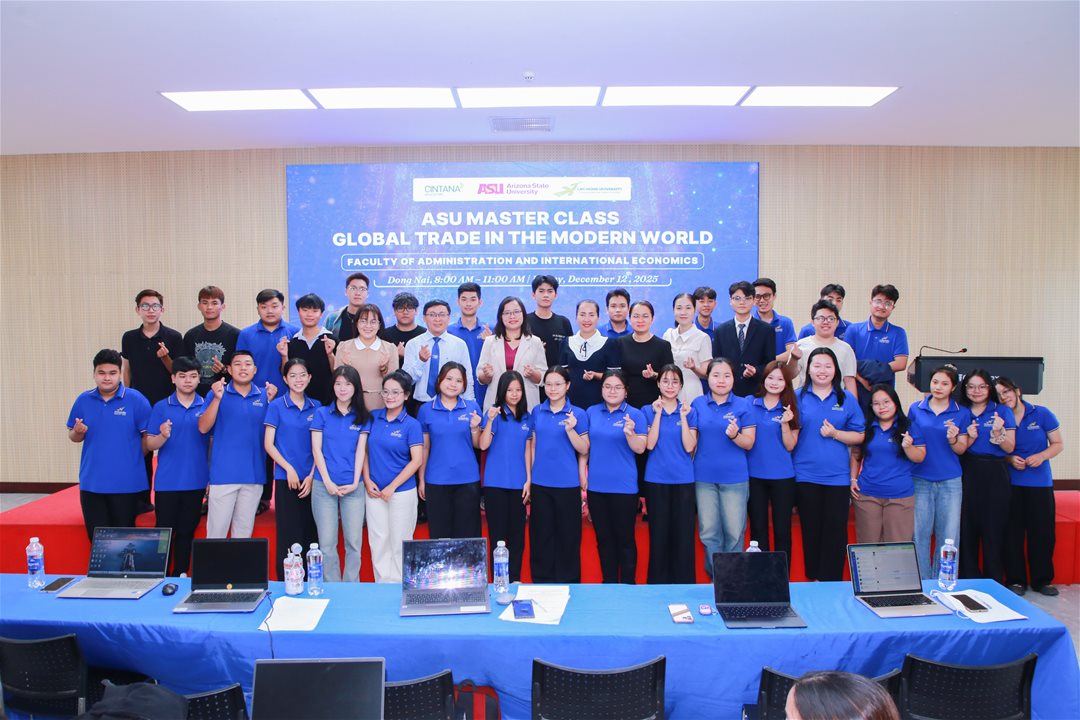 Sáng và chiều ngày 12/12/2025, Khoa Quản trị - Kinh tế Quốc tế (Trường Đại học Lạc Hồng) đã tổ chức thành công lớp học chuyên đề ASU Master Class với chủ đề "Global Trade in the Modern World". Hai buổi học đầu tiên dành cho sinh viên ngành Quản trị Kinh doanh và Marketing đã diễn ra sôi nổi, mang lại nhiều giá trị thực tiễn và mở ra những góc nhìn mới mẻ về nền kinh tế thế giới.
