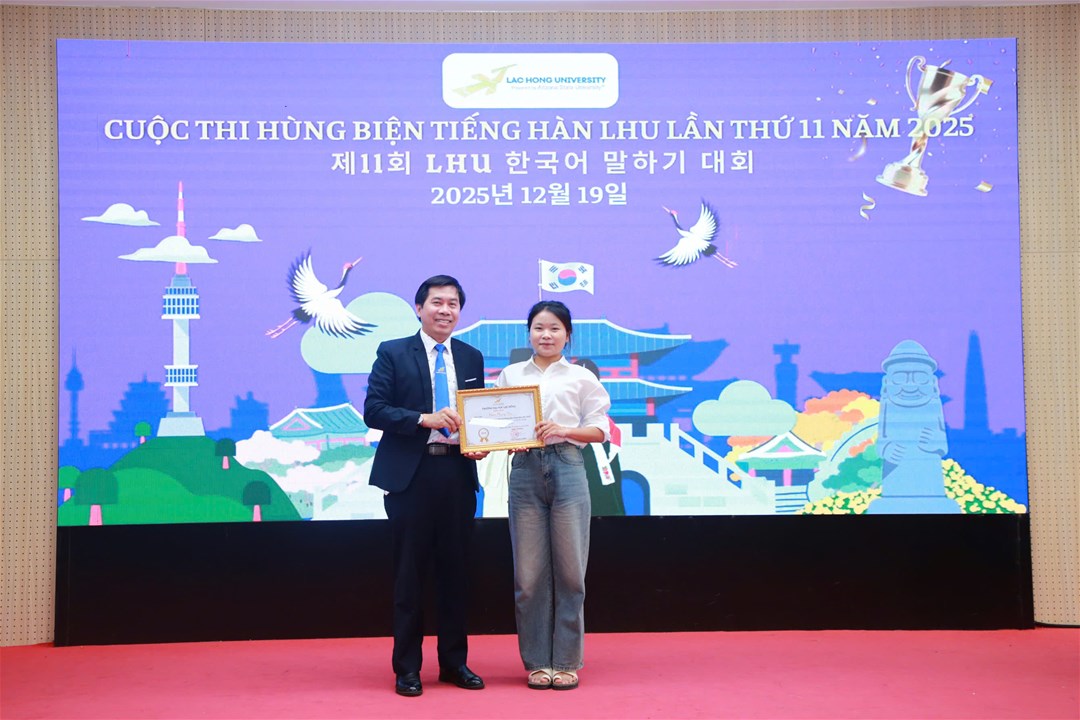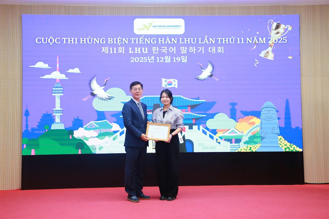Chiều ngày 19/12/2025, tại Hội trường A301, cơ sở 1, Trường Đại học Lạc Hồng, ngành Hàn Quốc học đã tổ chức thành công Vòng Chung kết Cuộc thi Hùng biện tiếng Hàn LHU lần thứ 11 năm 2025. Đây là một sân chơi học thuật giúp sinh viên ngành Hàn Quốc học có cơ hội nâng cao khả năng sử dụng tiếng Hàn, đặc biệt là kỹ năng nói và thuyết trình. Cuộc thi không chỉ khuyến khích sự tự tin trong việc biểu đạt tiếng Hàn mà còn mở ra cơ hội cho các bạn sinh viên thể hiện sự am hiểu về văn hóa, đất nước, con người Hàn Quốc, góp phần thắt chặt mối quan hệ tốt đẹp giữa nhân dân hai nước Việt Nam - Hàn Quốc.