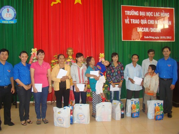 On Jan 16, Lac Hong University’s delegation including Secretary of the Youth Union Le Son Quang, Head of Department of Student Affairs Nguyen Ho Xuan Huong and some other comrades visited and presented Tet gifts totaling VND 24 million for 20 AO/ dioxin victims in Cam My and Dinh Quan districts. Each gift included VND 1 million and a Tet gift worth VND 200, 000.