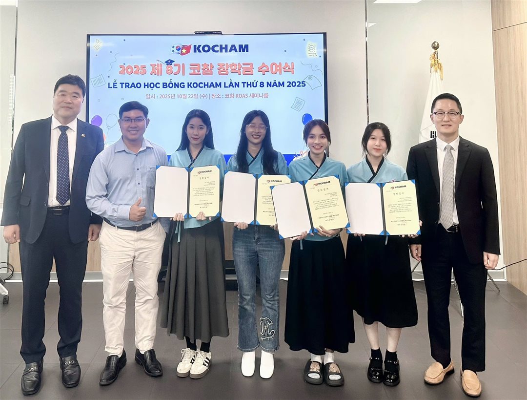 On October 20, 2025, the Korean Chamber of Commerce and Industry (KoCham) awarded four scholarships, each worth VND 5 million, to four outstanding students of LHU. This marks the eighth consecutive year KoCham has organized the Scholarship Award Ceremony to honor and encourage Vietnamese students majoring in Korean Studies.