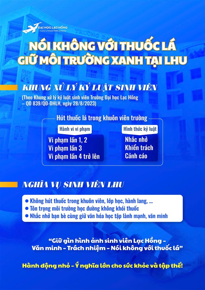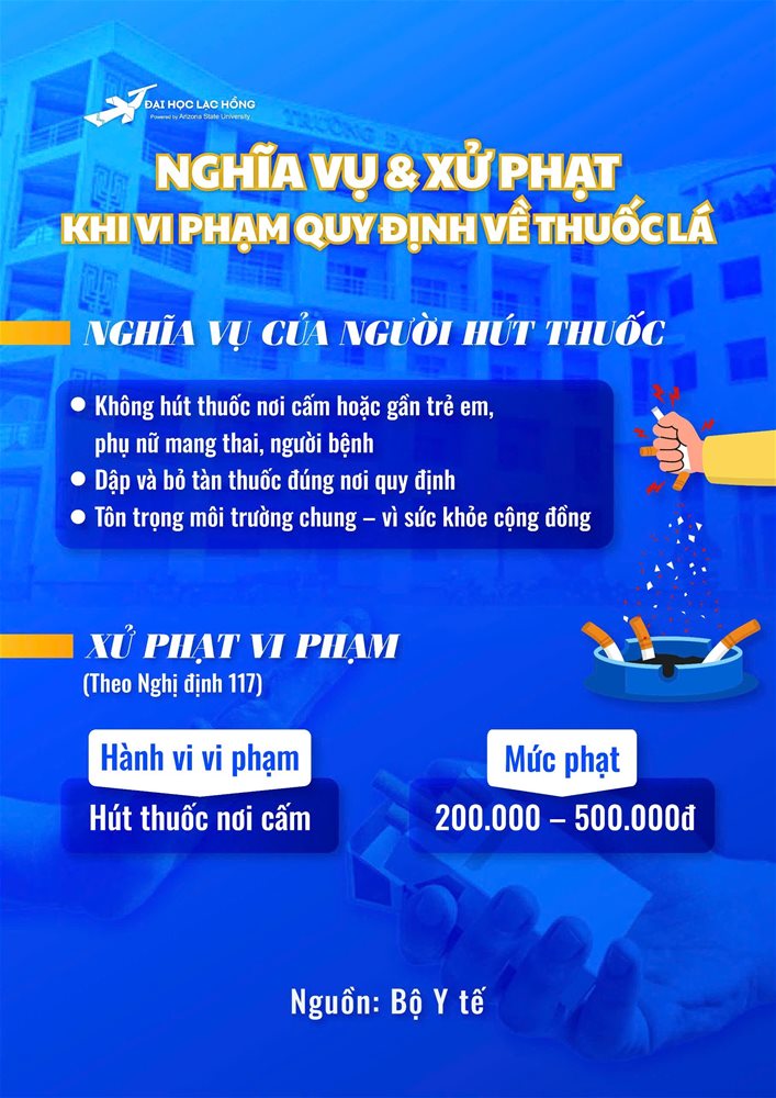 In alignment with Circular No. 11/2023/TT-BYT issued by the Ministry of Health on May 11, 2023, Lac Hong University strictly enforces a Smoke-Free Policy.