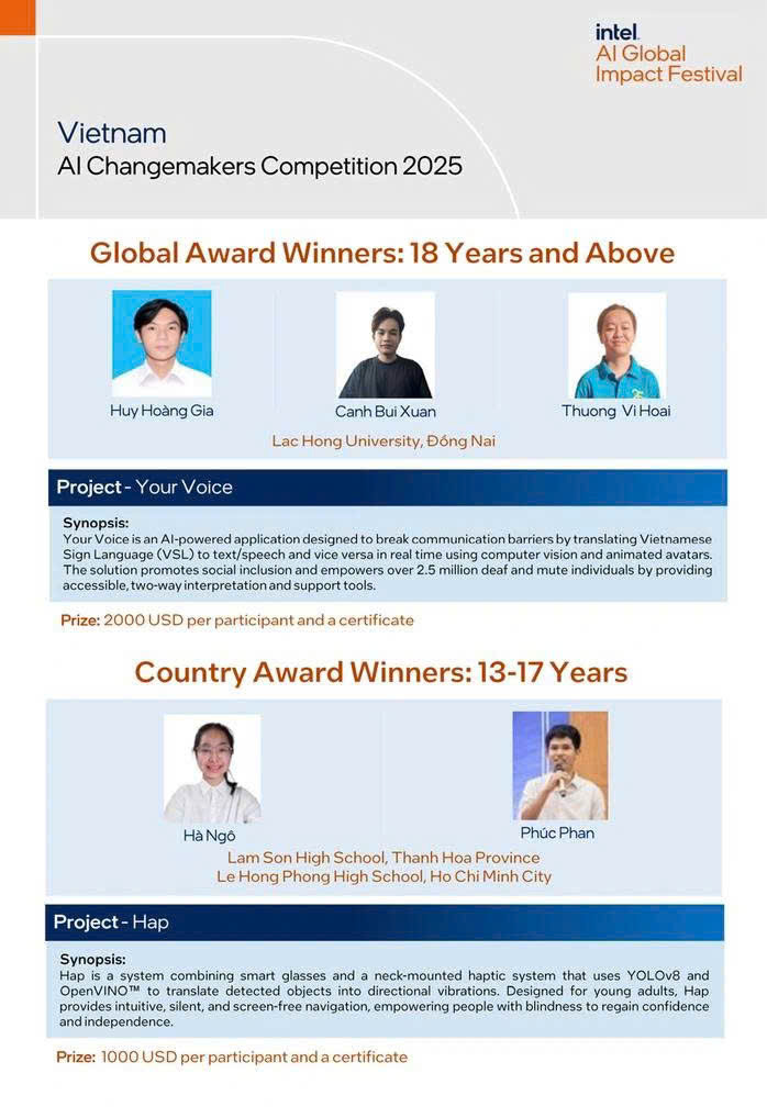 On October 13, 2025, the Faculty of Information Technology at Lac Hong University (LHU) marked a significant international milestone. The LHU student team—comprising Hoang Gia Huy, Bui Xuan Canh, and Vi Hoai Thuong—was honored with a Global Award at the Intel AI Global Impact Festival 2025 for their project, "Your Voice." They were one of only two teams from Vietnam to win in the global category, expanding the footprint of Vietnamese students on the international innovation map.