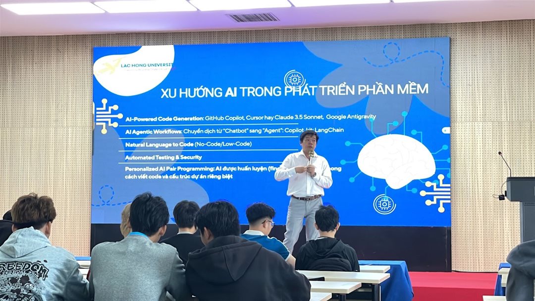 On March 19, 2026, the Faculty of Information Technology at Lac Hong University successfully hosted a workshop titled “Unlocking the Power of AI in Programming” in Room A301. The program aimed to provide students with a comprehensive perspective on the role of Artificial Intelligence in software development while guiding them toward the essential skills needed to adapt to modern technological trends.