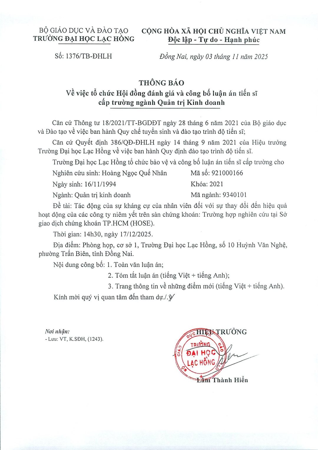Thông báo lịch bảo vệ luận án tiến sĩ cấp Trường ngành Quản trị kinh doanh tháng 12 năm 2025