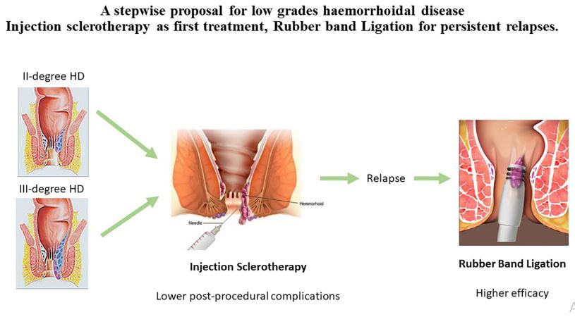 Figure 2. Hemorrhoid treatment methods: sclerotherapy and rubber band ligation.
